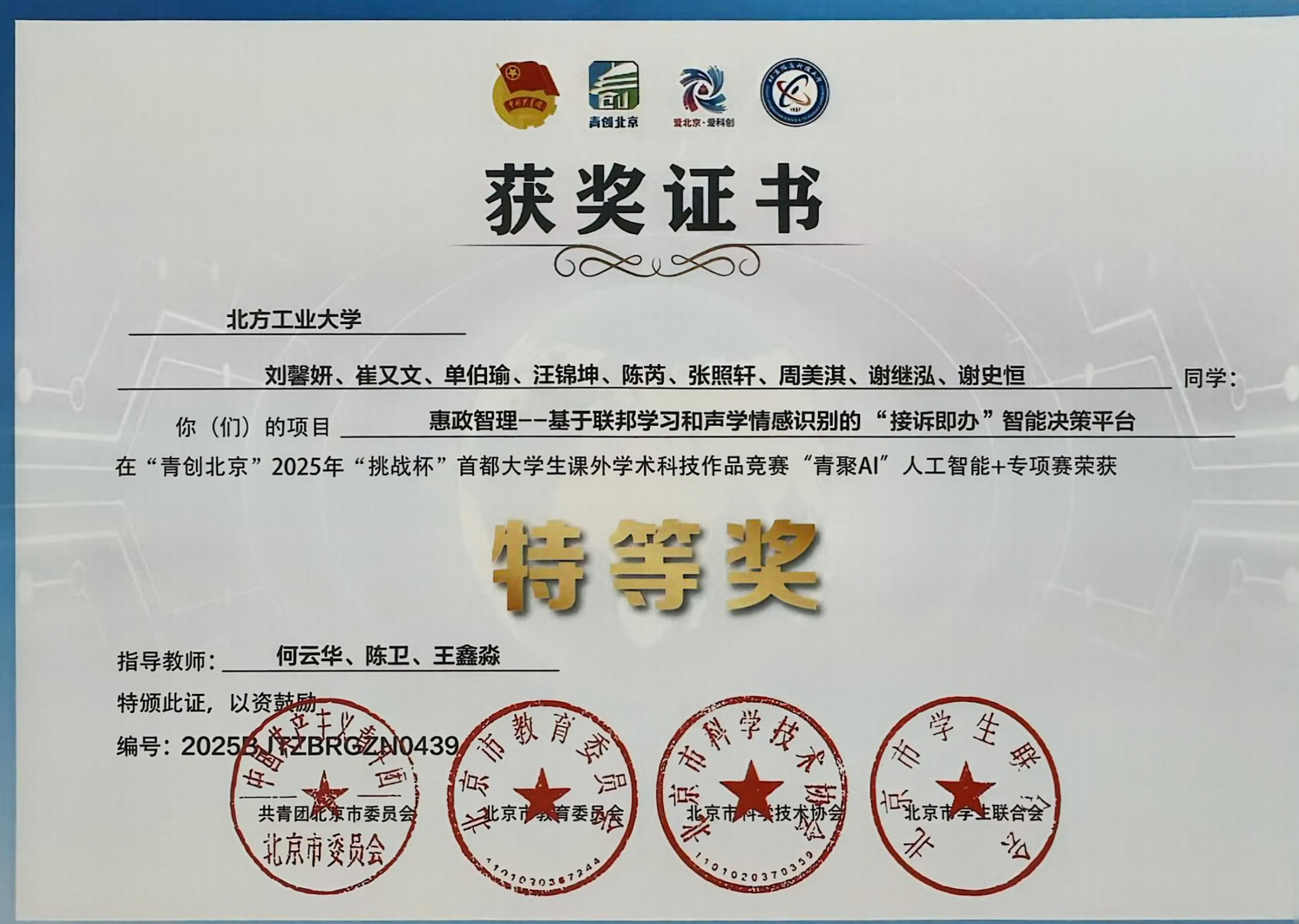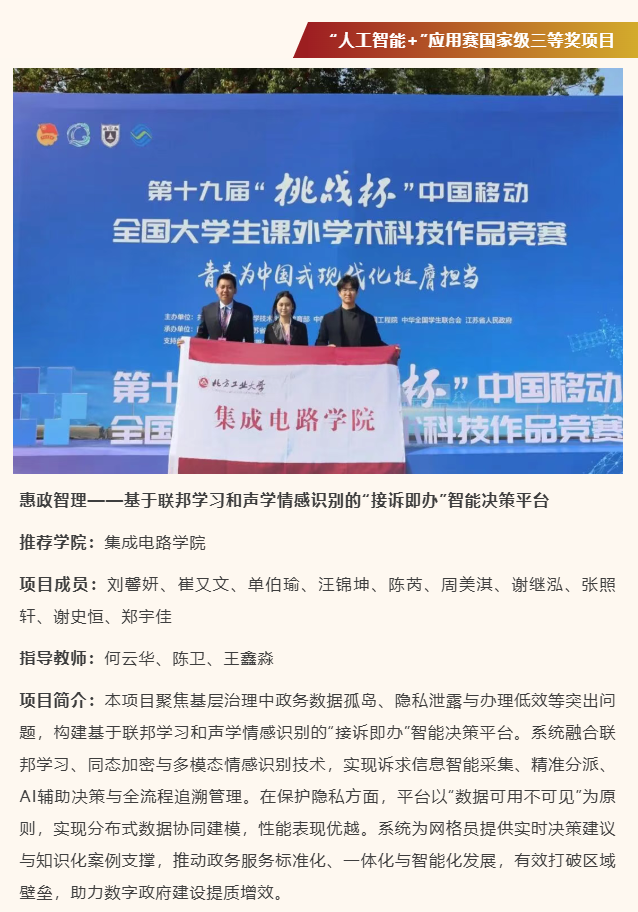 集成电路学院优秀学子获得“青创北京”2025年“挑战杯”首都大学生课外学术科技作品竞赛“青聚AI”人工智能+专项赛,特等奖1项: